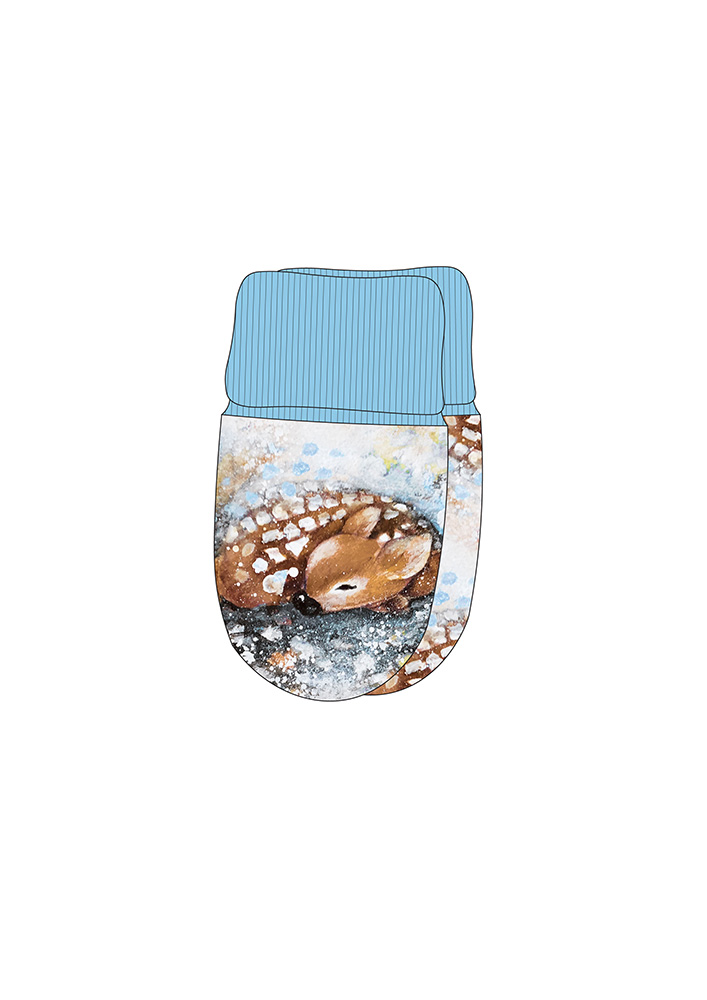 Vauvan tumput pitkillä resorivarsilla. Materiaali on kotimaista interlockneulosta, joka on 100 % luomupuuvillaa. Kuosin on maalannut Päivi Soikkeli. Tuote on suunniteltu ja valmistettu Suomessa. Tuotteelle on myönnetty suomalaisesta työstä kertova Avainlippu-merkki.