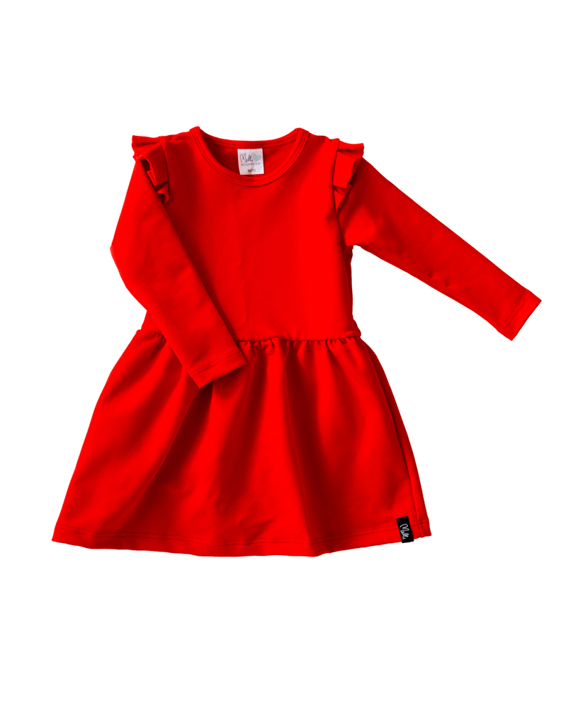 Lasten collegemekko jossa olalla röyhelöt. Materiaali on pehmeää ja miellyttävän tuntuista collegeneulosta, joka sisältää 95 % luomupuuvillaa ja 5 % elastaania. Tuote on suunniteltu ja valmistettu Suomessa. Tuotteelle on myönnetty suomalaisesta työstä kertova Avainlippu-merkki.