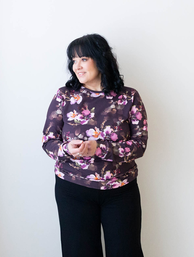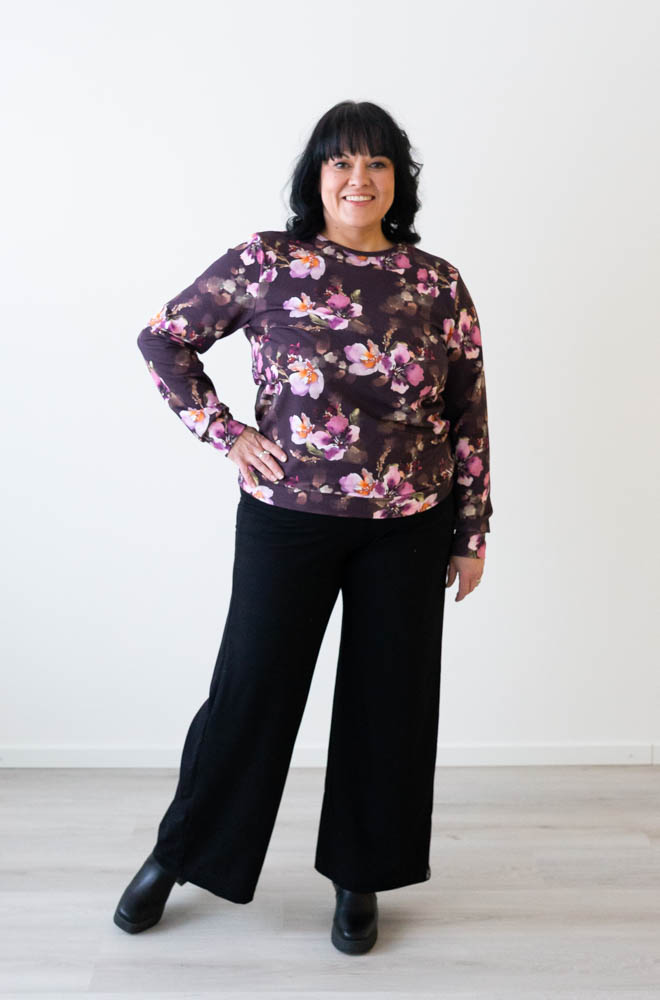 Naisten monikäyttöinen collegepaita, jossa kaunis vesivärimäinen Mystic flower -kuosi. Materiaali on pehmeää ja miellyttävän tuntuista collegeneulosta, joka sisältää 95 % luomupuuvillaa ja 5 % elastaania. Tuote on suunniteltu ja valmistettu Suomessa ja sille on myönnetty suomalaisesta työstä kertova Avainlippu-merkki.