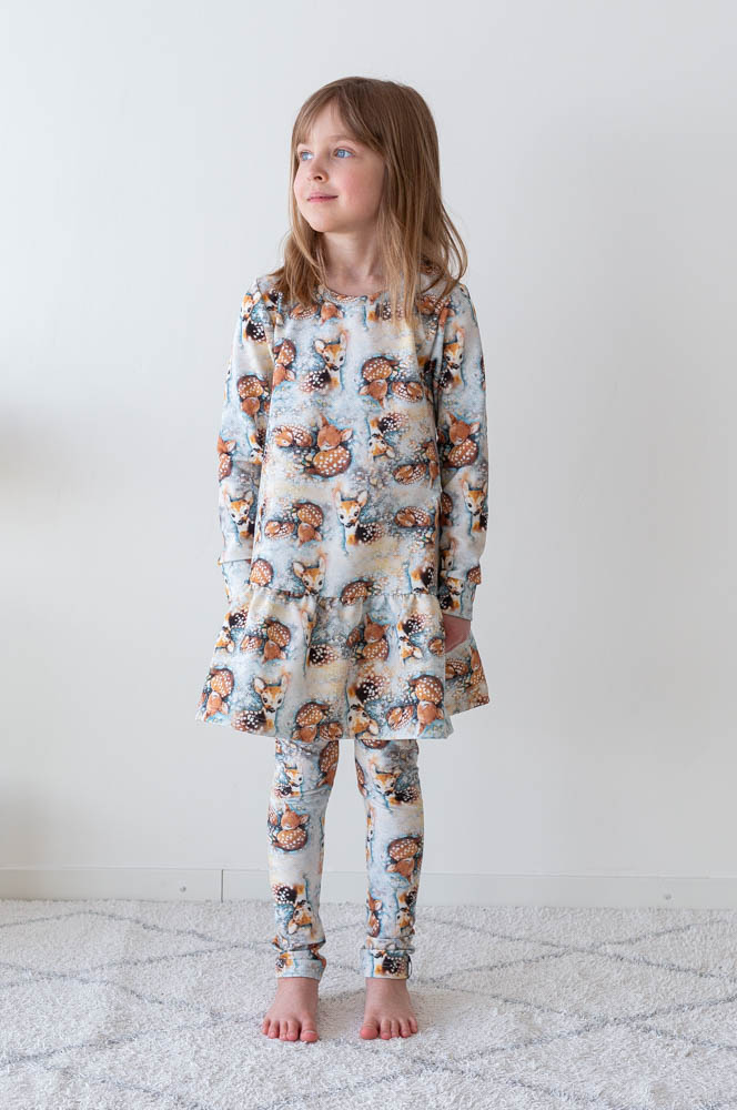 Lasten collegelegginsit ihanalla Bambit lehtisateessa-kuosilla. Kuosin on maalannut Päivi Soikkeli. Materiaali on pehmeää luomupuuvillacollegea, joka sisältää 95 % luomupuuvillaa ja 5 % elastaania. Kaikki tuotteemme suunnitellaan ja valmistetaan Suomessa. Tuotteelle on myönnetty suomalaisesta työstä kertova Avainlippu-merkki.