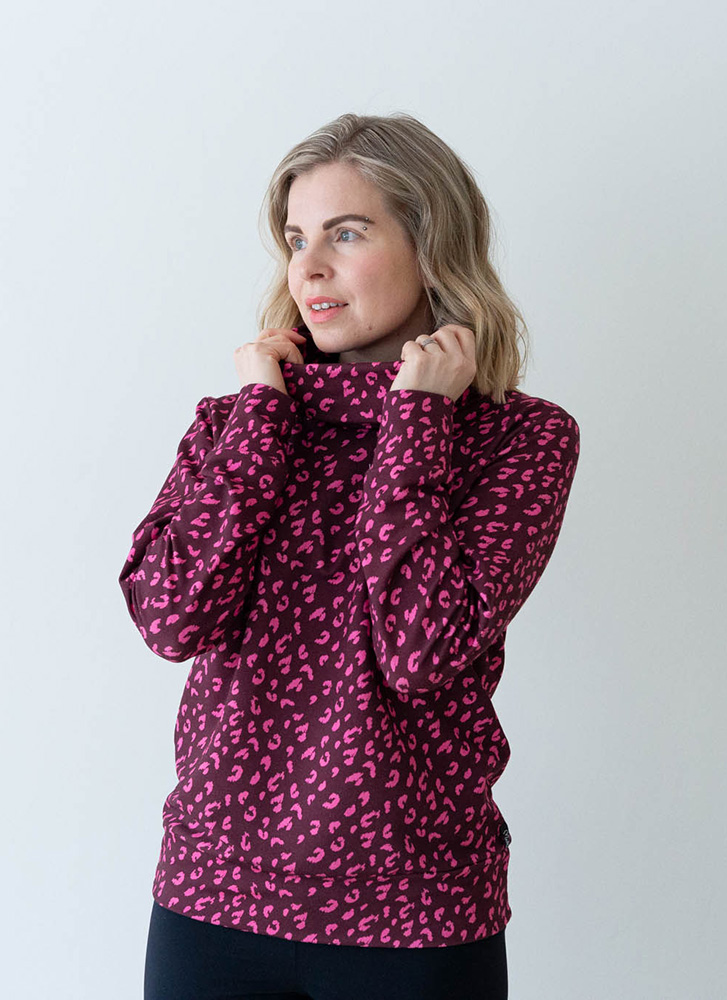 Naisten rento ja mukava collegepaita, jossa eläinaiheinen -kuosi ja korkea näyttävä kaulus. Materiaali on pehmeää ja miellyttävän tuntuista collegeneulosta, joka sisältää 95 % luomupuuvillaa ja 5 % elastaania. Tuote on suunniteltu ja valmistettu Suomessa ja sille on myönnetty suomalaisesta työstä kertova Avainlippu-merkki.