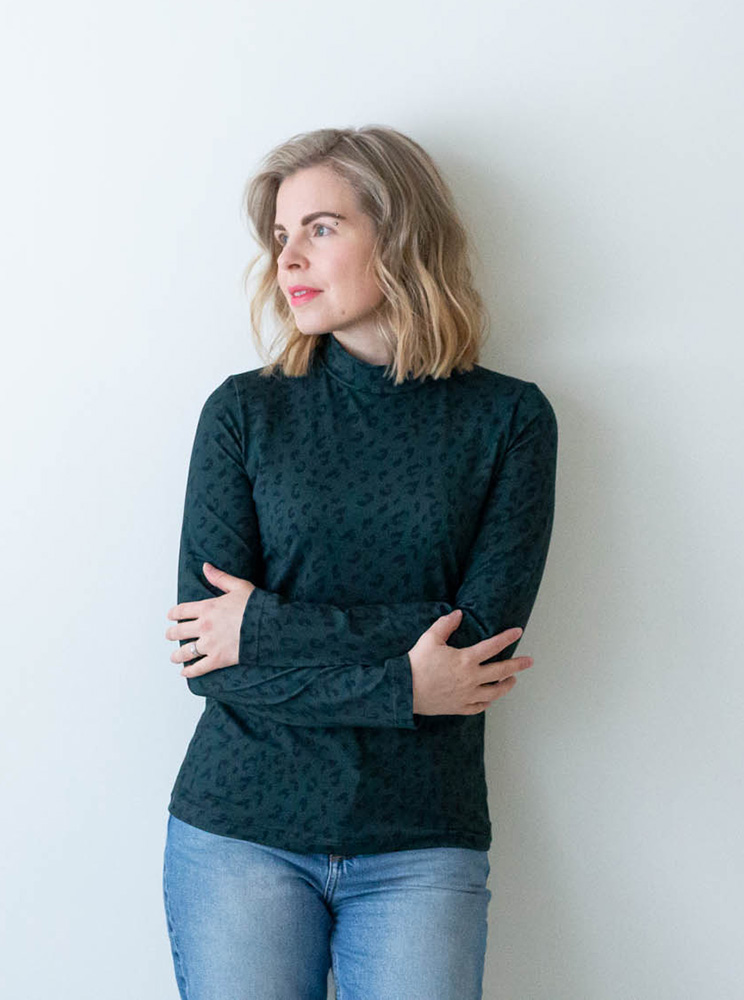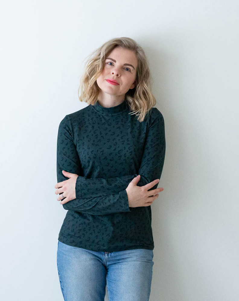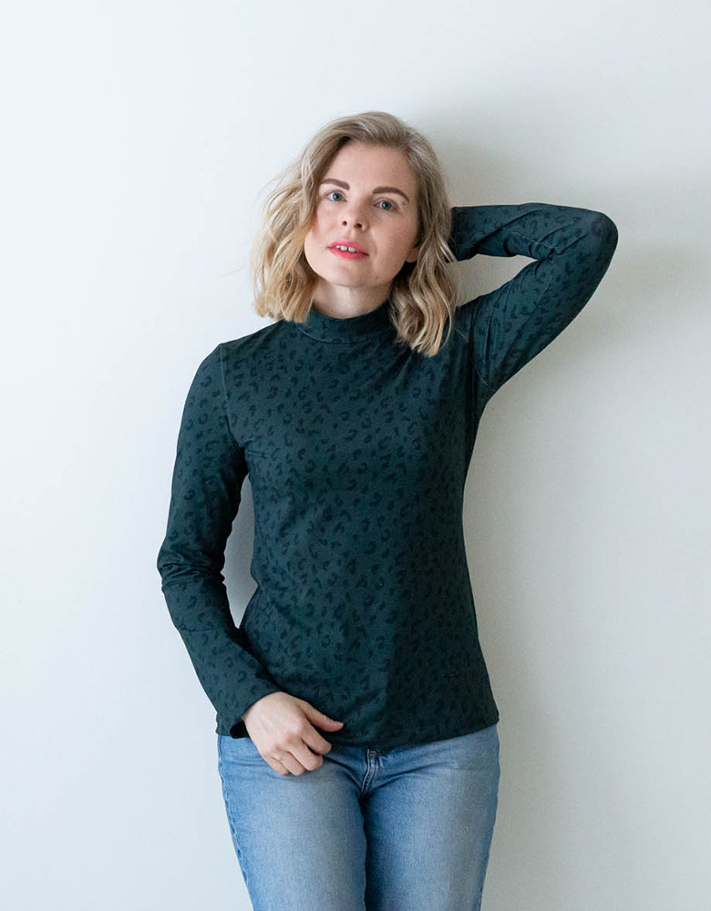 Naisten kuosillinen paita pitkillä hihoilla ja kauniilla korkealla kauluksella. Materiaali on pehmeää jerseyneulosta, joka on 95 % luomupuuvillaa ja 5 % elastaania. Tuote on suunniteltu ja valmistettu Suomessa. Tuotteelle on myönnetty suomalaisesta työstä kertova Avainlippu-merkki. Paidassa on klassinen istuvuus ja se sopii täydellisesti sekä arkisiin, että juhlavimpiin tilaisuuksiin.