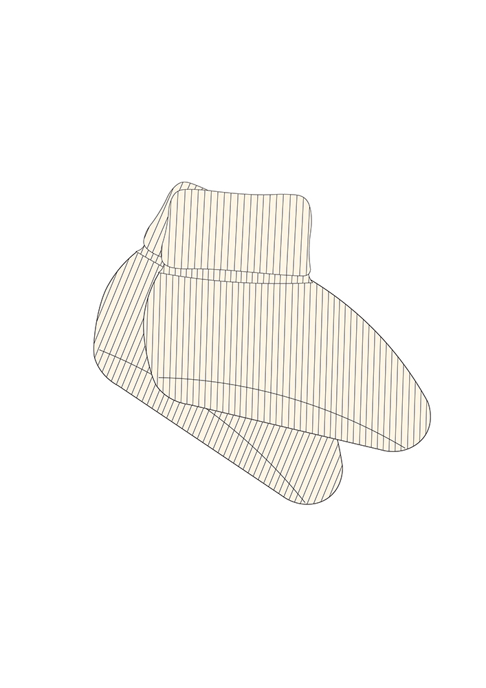 Kauniit ribbineuloksesta valmistetut vauvan tossut pitkillä resorivarsilla. Materiaali on pehmeää ribbineulosta, joka sisältää 95 % luomupuuvillaa ja 5 % elastaania. Tuote on suunniteltu ja valmistettu Suomessa. Tuotteelle on myönnetty suomalaisesta työstä kertova Avainlippu-merkki.