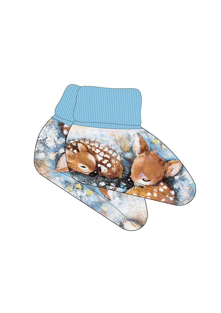 Vauvan tossut pitkillä resorivarsilla. Materiaali on pehmeää interlockneulosta, joka on 100 % luomupuuvillaa. Kuosin on maalannut Päivi Soikkeli. Tuote on suunniteltu ja valmistettu Suomessa. Tuotteelle on myönnetty suomalaisesta työstä kertova Avainlippu-merkki.