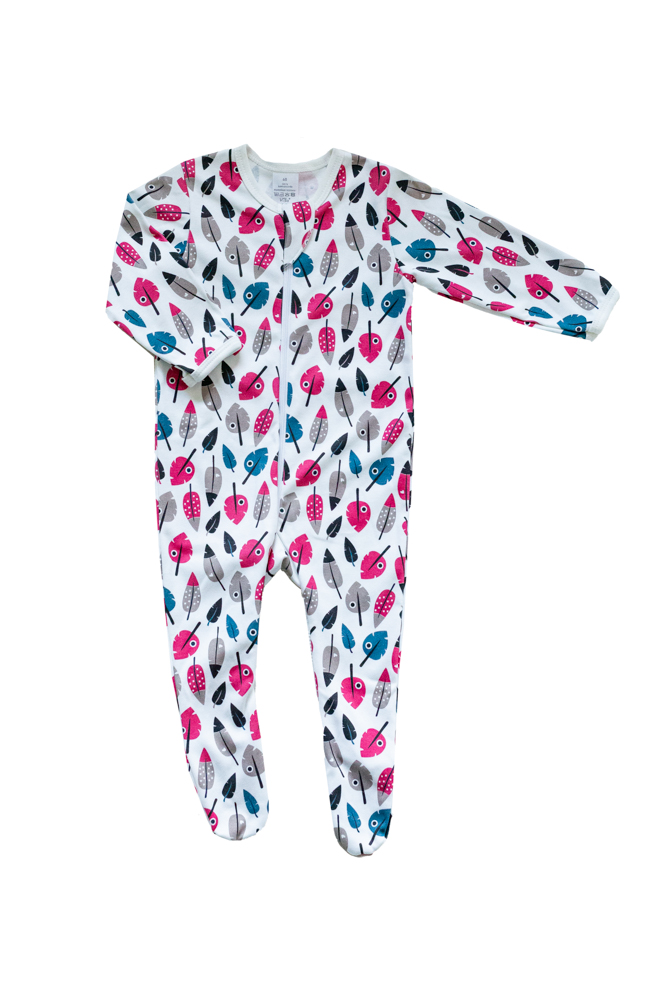 Vauvan vetoketjullinen unihaalari. Unihaalarissa on jalkaterät ja vetoketjussa suojaosa. Materiaali on pehmeää interlocktrikoota, joka on 100 % luomupuuvillaa. Tuote on suunniteltu ja valmistettu Suomessa. Tuotteelle on myönnetty suomalaisesta työstä kertova Avainlippu-merkki.