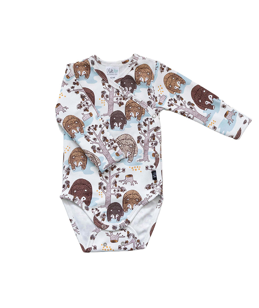 Pitkäikäinen, ribbineuloksesta valmistettu kietaisubody. Kokoa voi säädellä haaraosan kahdessa rivissä olevien neppareiden avulla ja hihoissa on käännettävät hihansuut pieniä sormia suojaamaan. Materiaali on pehmeää interlocktrikoota, joka on 100 % luomupuuvillaa. Tuote on suunniteltu ja valmistettu Suomessa. Tuotteelle on myönnetty suomalaisesta työstä kertova Avainlippu-merkki.