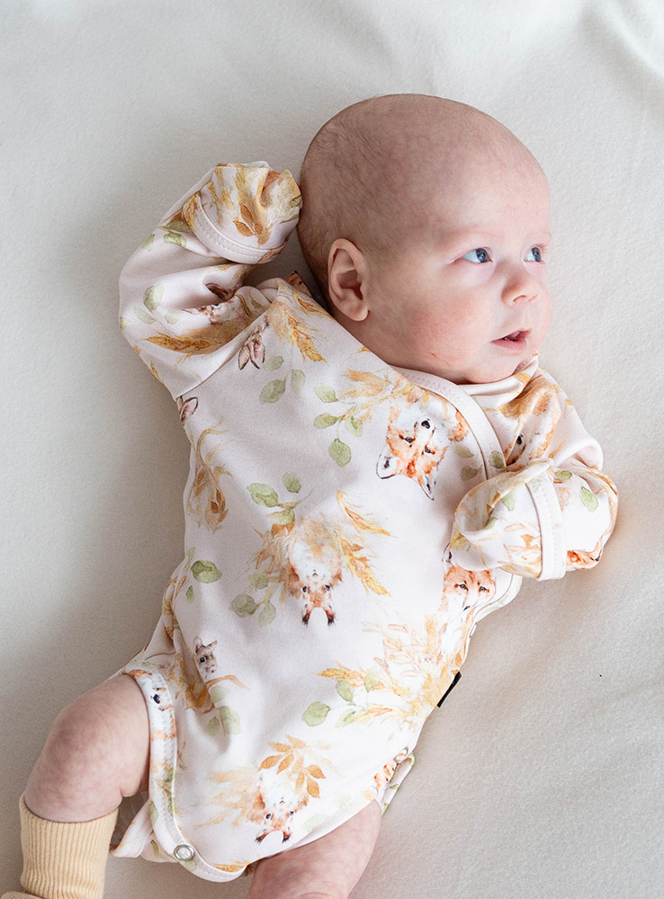 Pitkäikäinen, ribbineuloksesta valmistettu kietaisubody. Kokoa voi säädellä haaraosan kahdessa rivissä olevien neppareiden avulla ja hihoissa on käännettävät hihansuut pieniä sormia suojaamaan. Materiaali on pehmeää interlocktrikoota, joka on 100 % luomupuuvillaa. Tuote on suunniteltu ja valmistettu Suomessa. Tuotteelle on myönnetty suomalaisesta työstä kertova Avainlippu-merkki.