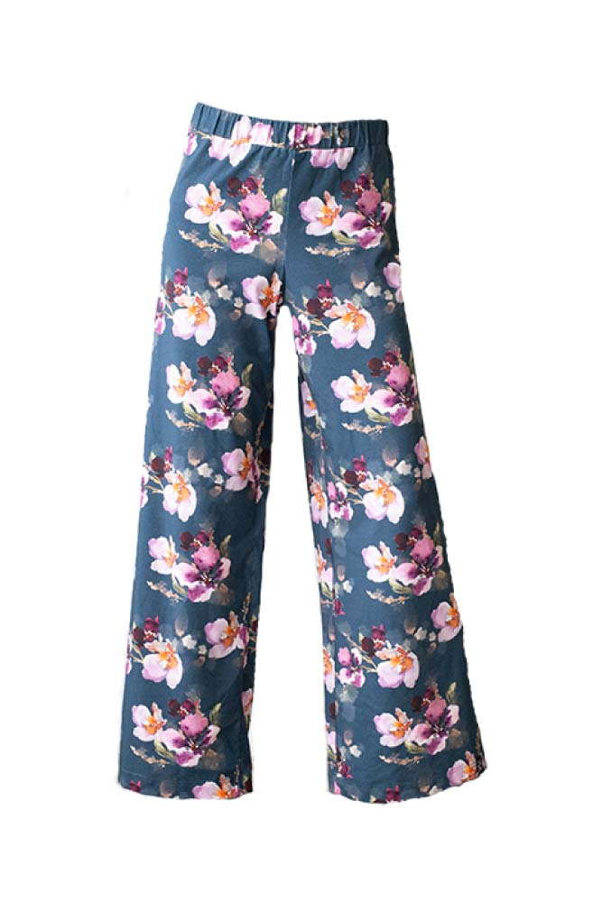 Naisten kauniisti laskeutuvat kuosilliset housut, joissa väljät täyspitkät lahkeet ja rento istuvuus. Vyötäröllä on joustava kuminauha. Monikäyttöinen luottovaate, jota on helppo yhdistellä asukokonaisuuksiin ympäri vuoden. Tuote on suunniteltu ja valmistettu Suomessa. Tuotteelle on myönnetty suomalaisesta työstä kertova Avainlippu-merkki.