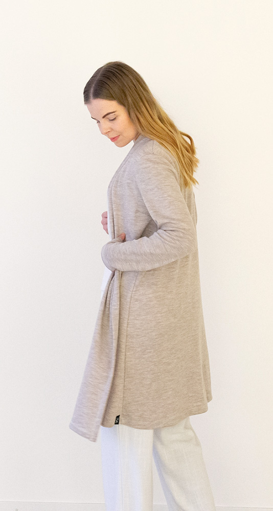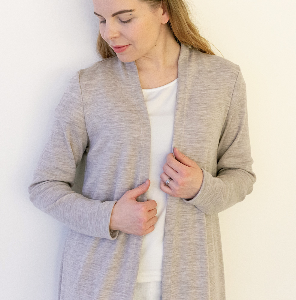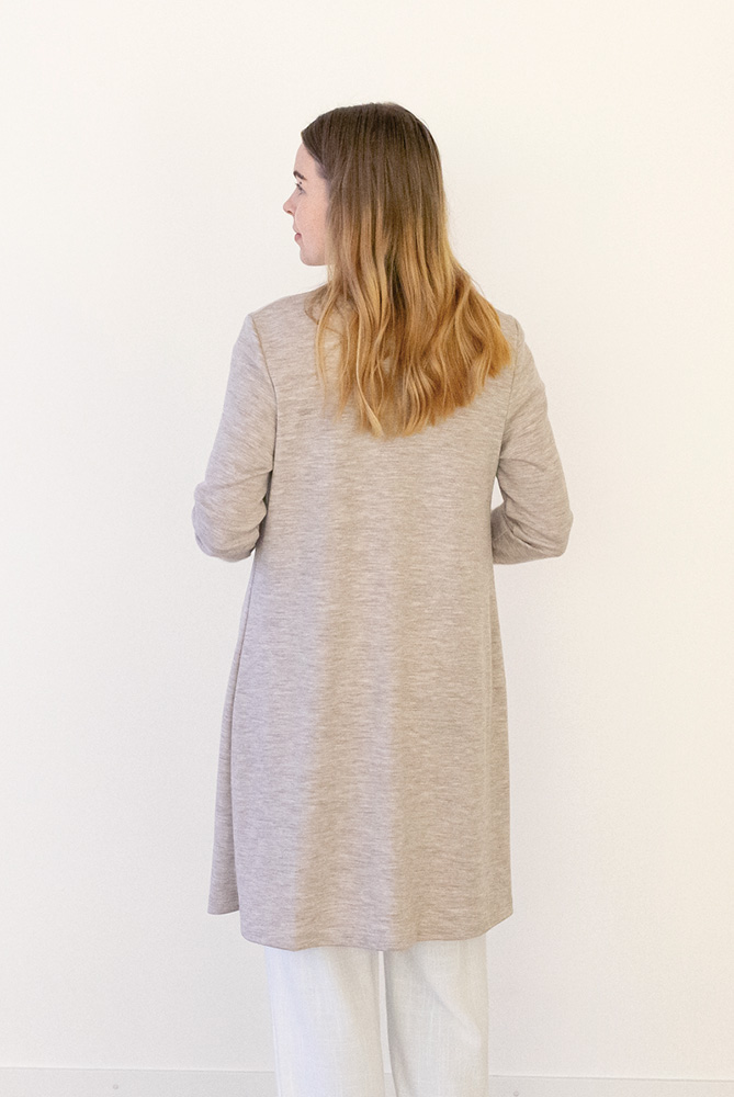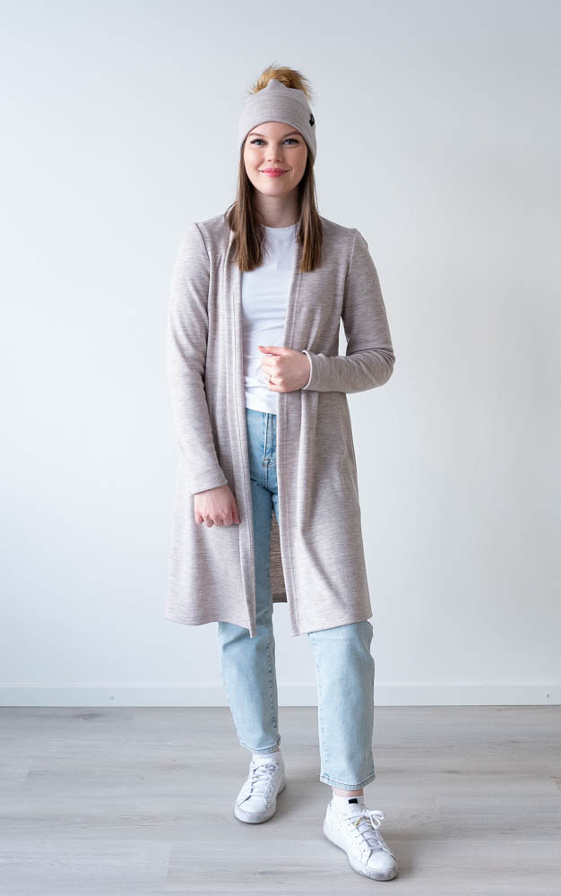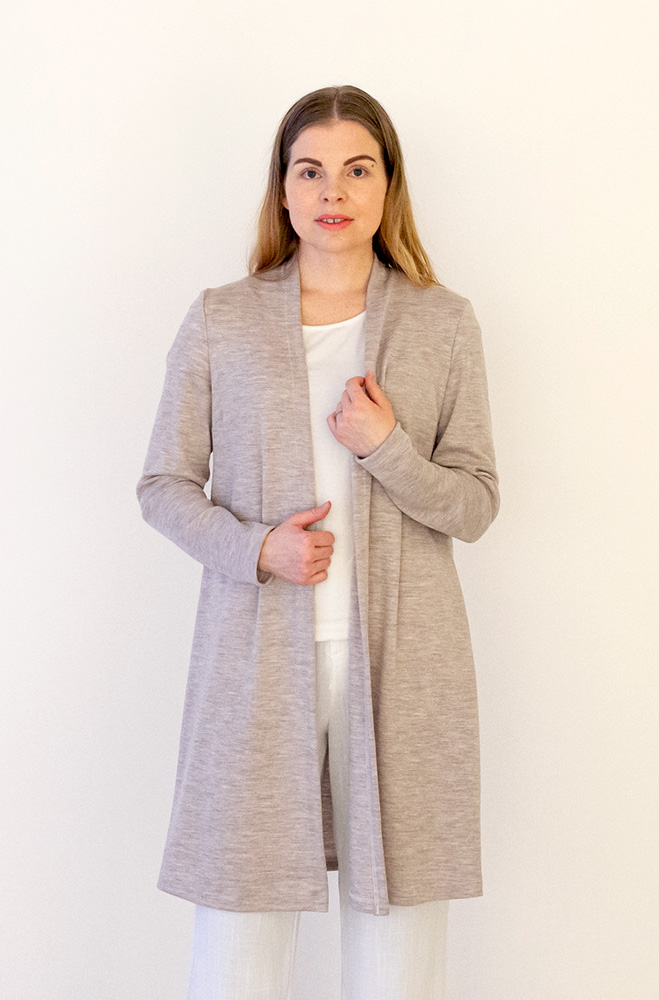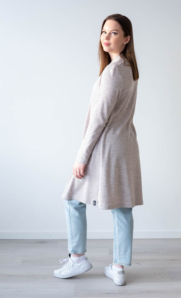 Pehmeä ja lämmin merinovillainen neuletakki, jossa klassisen kaunis istuva mitoitus. Tässä mallissa on paljon pyydetty pidempi helman pituus, ulottuen hieman polven yläpuolelle. Materiaali on kotimaista interlockneulosta, joka on 100 % merinovillaa (mulesing-vapaa). Neuletakki on suunniteltu ja valmistettu Suomessa ja sille on myönnetty suomalaisesta työstä kertova Avainlippu-merkki.