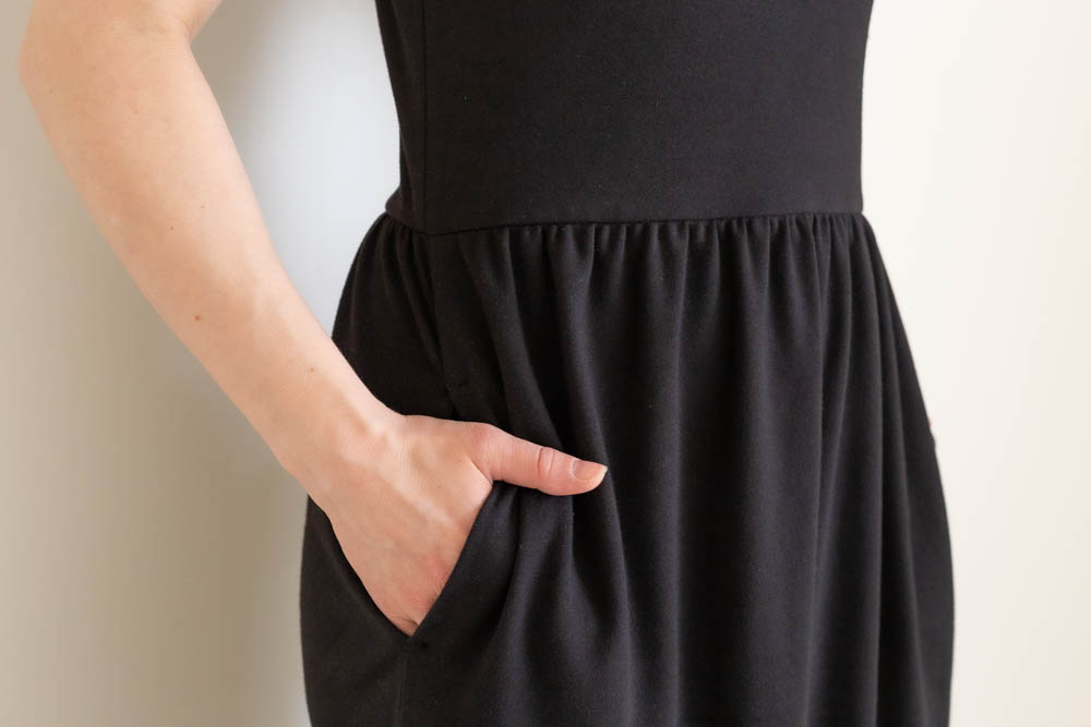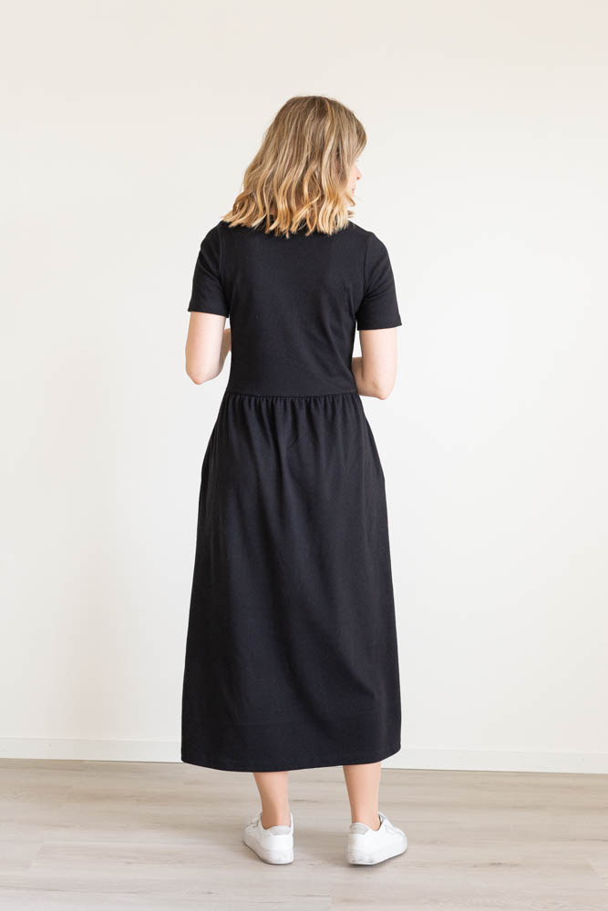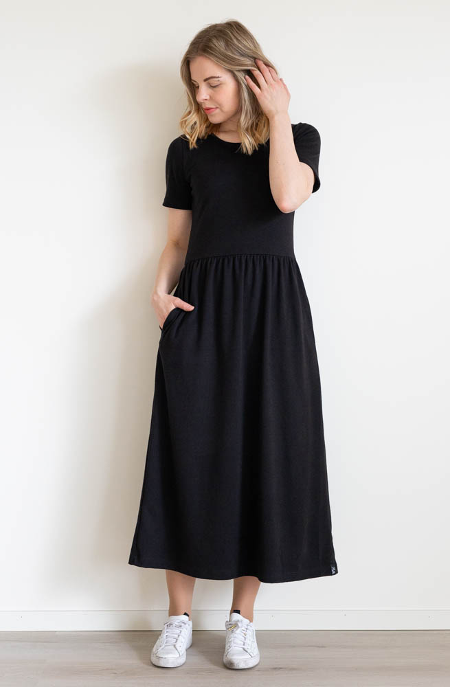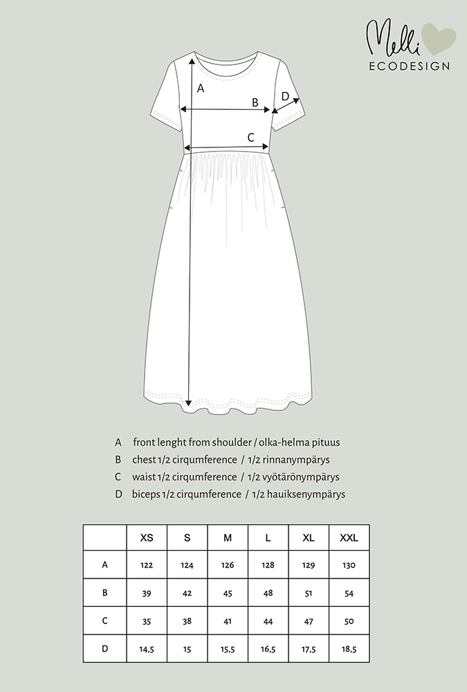 Tämä on mekko, jonka puet uudelleen ja uudelleen. Helppo, mukava ja aina hyvä päällä arjessa, töissä ja tilanteissa, joissa haluat näyttää huolitellulta ilman miettimistä. Mekon sivuilla on isot taskut ja joustava kuminauha vyötäröllä. Tätä luottomekkoa voi käyttää ympäri vuoden eri asukokonaisuuksissa. Materiaali on pehmeää kotimaista interlocktrikoota, joka on 100 % luomupuuvillaa. Tuote on suunniteltu ja valmistettu Suomessa. Tuotteelle on myönnetty suomalaisesta työstä kertova Avainlippu-merkki.