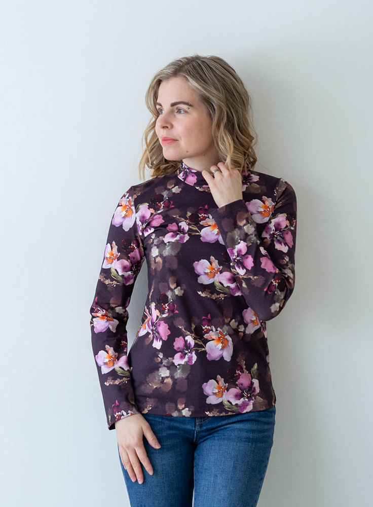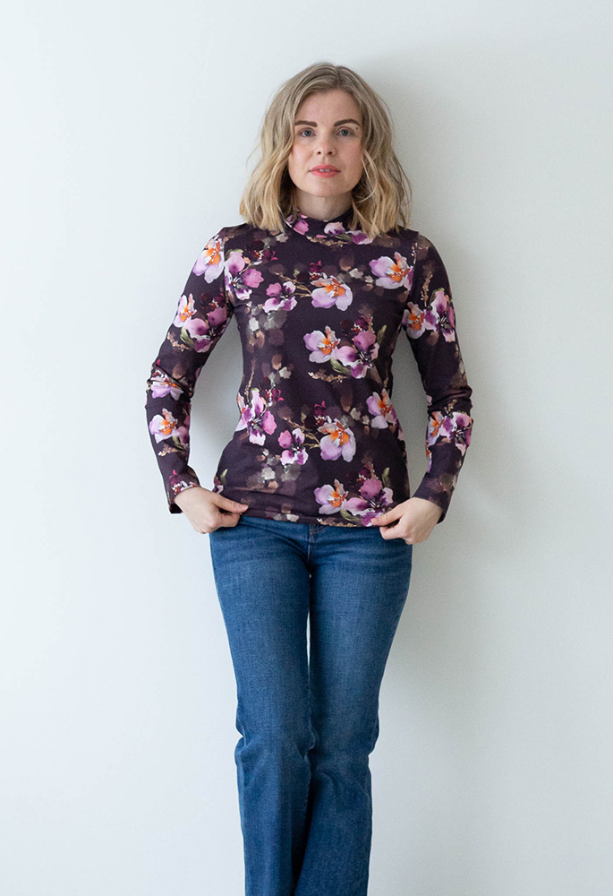 Naisten kuosillinen paita pitkillä hihoilla ja kauniilla korkealla kauluksella. Materiaali on pehmeää jerseyneulosta, joka on 95 % luomupuuvillaa ja 5 % elastaania. Tuote on suunniteltu ja valmistettu Suomessa. Tuotteelle on myönnetty suomalaisesta työstä kertova Avainlippu-merkki. Paidassa on klassinen istuvuus ja se sopii täydellisesti sekä arkisiin, että juhlavimpiin tilaisuuksiin.