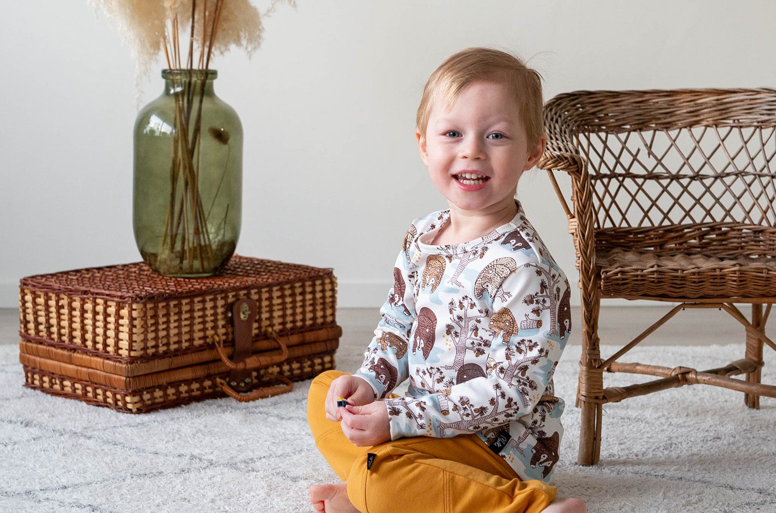 Materiaali on pehmeää interlocktrikoota, joka on 100 % luomupuuvillaa. Tuote on suunniteltu ja valmistettu Suomessa. Tuotteelle on myönnetty suomalaisesta työstä kertova Avainlippu-merkki.