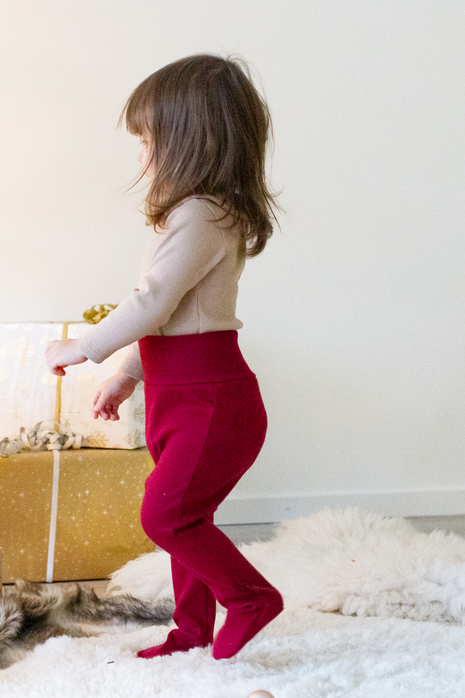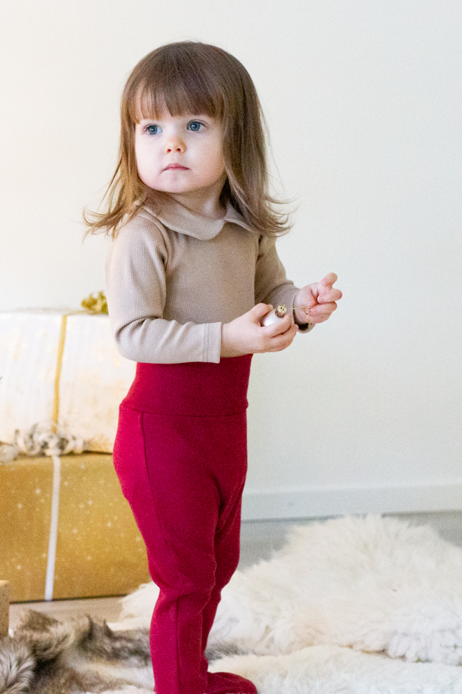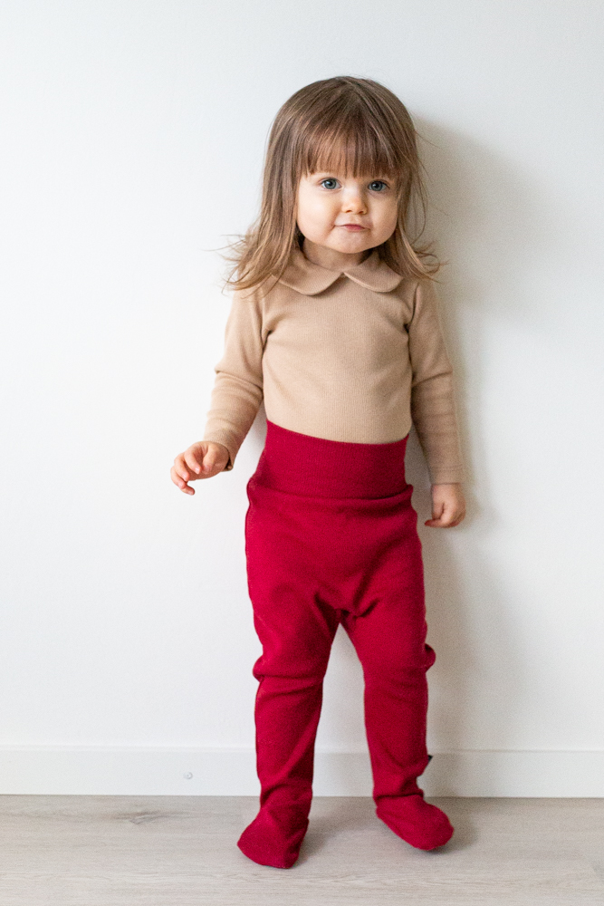 Vauvan puolipotkuhousut, joissa sukkaosat ja resori vyötäröllä.Materiaali on pehmeää ribbineulosta, joka sisältää 95 % luomupuuvillaa ja 5 % elastaania. Tuote on suunniteltu ja valmistettu Suomessa. Tuotteelle on myönnetty suomalaisesta työstä kertova Avainlippu-merkki.
