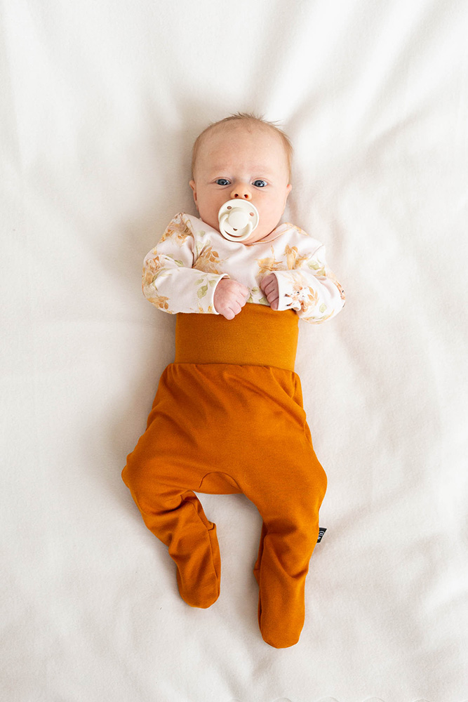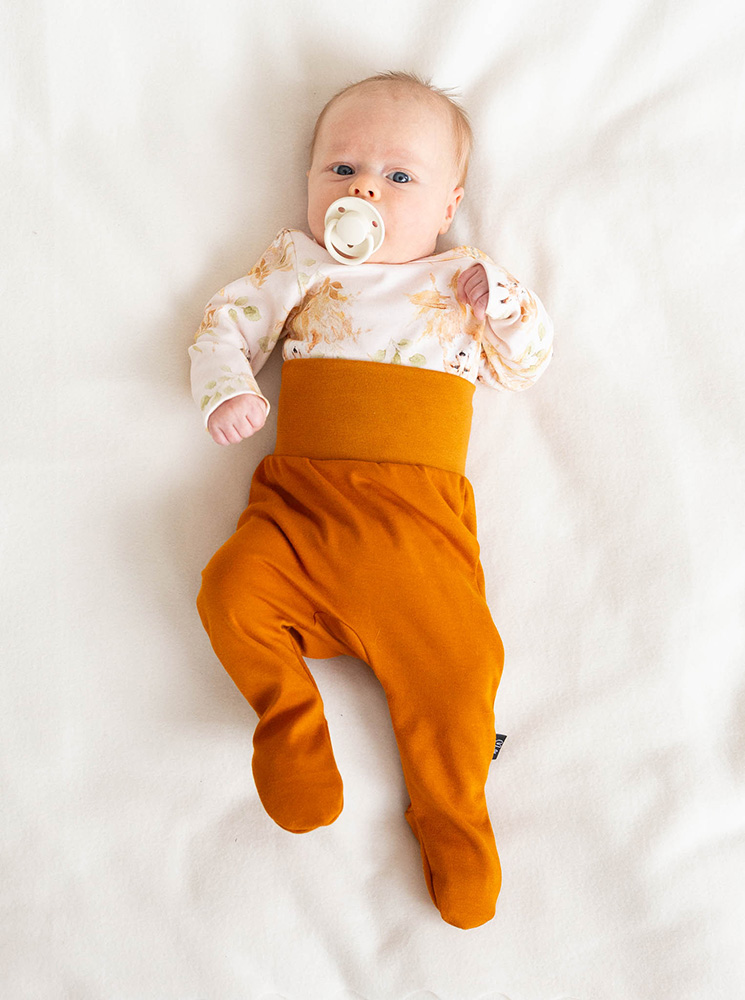 Yhdistele yläosaksi sopivia yksivärisiä tai kuosillisia ribbineuloksesta valmistettuja vauvan bodeja.