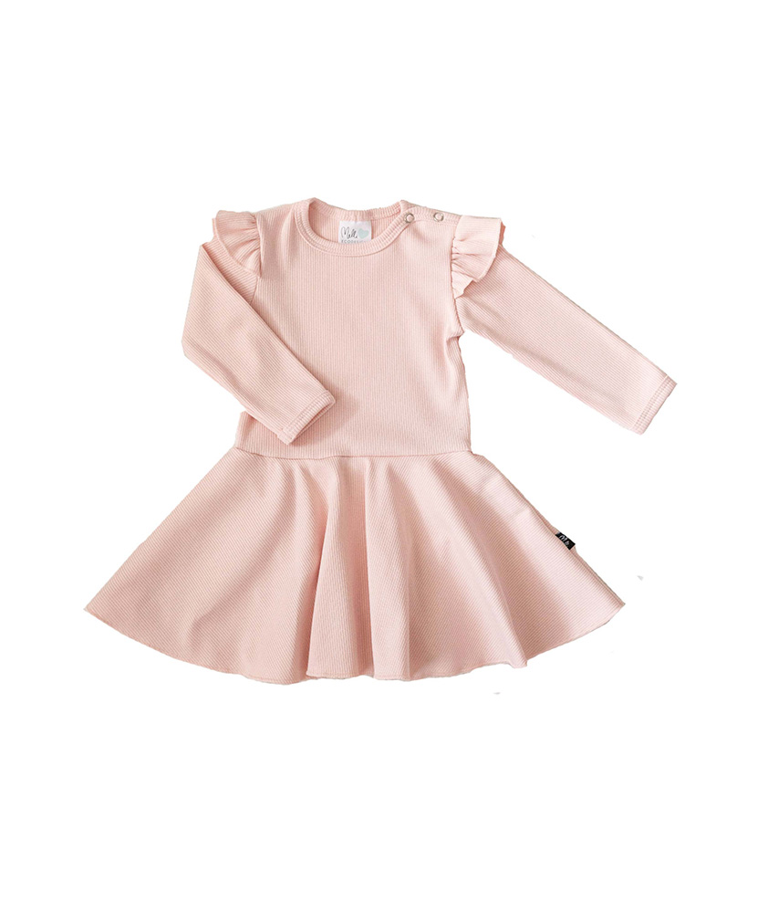 Kaunis vauvan ribbinen bodymekko, jossa mekon helman alla bodyn haaraosa. Materiaali on pehmeää ribbineulosta, joka sisältää 95 % luomupuuvillaa ja 5 % elastaania. Bodyn haaraosassa on tuplanepparirivi, joka mahdollistaa vaatteen käytön kahdessa koossa. Tuote on suunniteltu ja valmistettu Suomessa. Tuotteelle on myönnetty suomalaisesta työstä kertova Avainlippu-merkki.