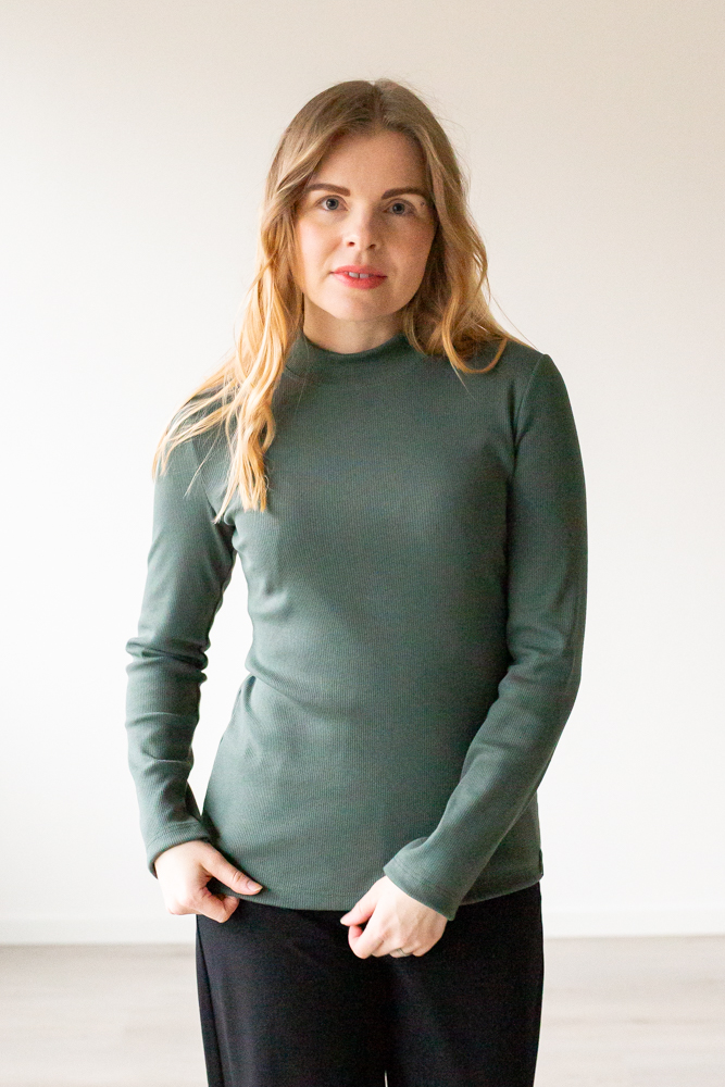 Naisten pitkähihainen ribbipaita kauniilla korkealla kauluksella. Paidassa on klassinen istuvuus ja sitä voi yhdistellä monipuolisesti erilaisten alaosien kanssa. Materiaali on pehmeää ribbineulosta, joka sisältää 95 % luomupuuvillaa ja 5 % elastaania. Tuote on suunniteltu ja valmistettu Suomessa. Tuotteelle on myönnetty suomalaisesta työstä kertova Avainlippu-merkki.
