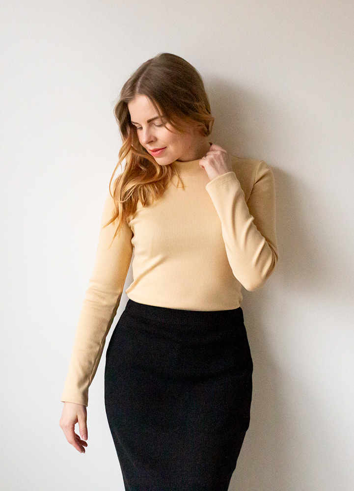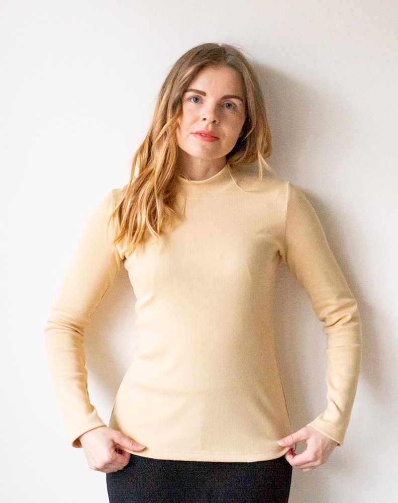 Naisten pitkähihainen ribbipaita kauniilla korkealla kauluksella. Paidassa on klassinen istuvuus ja sitä voi yhdistellä monipuolisesti erilaisten alaosien kanssa. Materiaali on pehmeää ribbineulosta, joka sisältää 95 % luomupuuvillaa ja 5 % elastaania. Tuote on suunniteltu ja valmistettu Suomessa. Tuotteelle on myönnetty suomalaisesta työstä kertova Avainlippu-merkki.