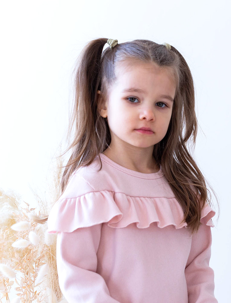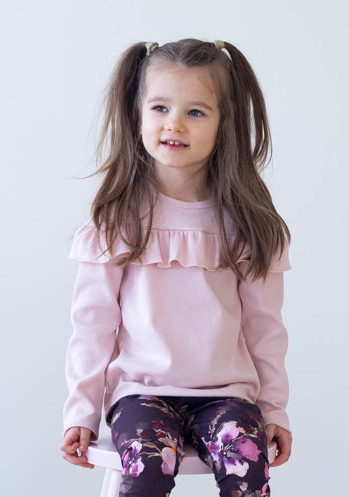Yhdistele alaosaksi paitaan kauniisti sopivia yksivärisiä tai kuosillisia ribbineuloksesta valmistettuja lasten legginsejämme tai collegesta valmistettuja polvipaikkahousujamme.