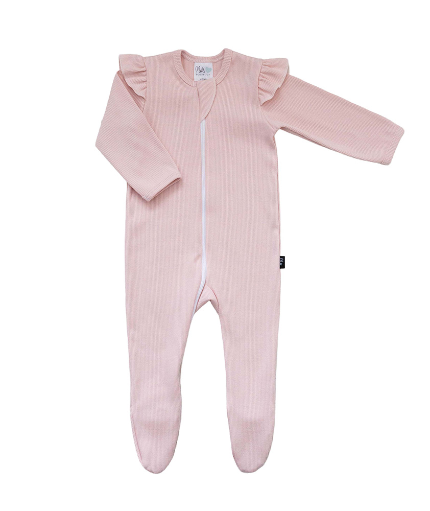 Vauvan ja lasten vetoketjullinen unihaalari, jossa olalla söpöt röyhelöt. Unihaalarissa on jalkaterät ja vetoketjussa suojaosa. Materiaali on pehmeää ribbineulosta, joka sisältää 95 % luomupuuvillaa ja 5 % elastaania. Tuote on suunniteltu ja valmistettu Suomessa. Tuotteelle on myönnetty suomalaisesta työstä kertova Avainlippu-merkki.